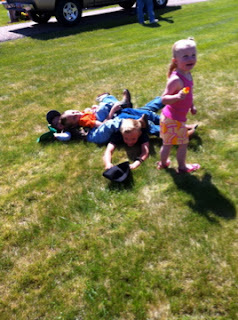 Bri put Stacia's shirt over her head and ran right into the back of Papa's truck. Thank goodness for band-aids.